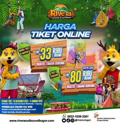 - Paket ini berisikan Gratis Tiket Masuk Rivera, Pilihan Wahana Rivera Outbound Bogor & Taman Burung.