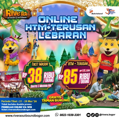- Paket ini berisikan Gratis Tiket Masuk Rivera, Gratis Taman Burung & Pilihan Wahana Rivera Outbound Bogor.